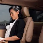 coverInteriér minibusu během pronájmu minibusu s obchodním cestujícím pracujícím na notebooku v prostorných a pohodlných zadních sedadlech