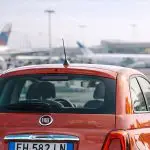 coverTravelers walking toward their rental car at Naples Airport, Italy, red Fiat 500